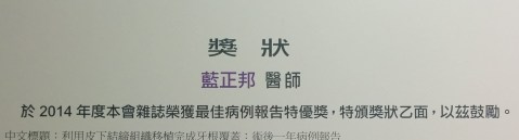 2013年,看到老戰友在別科進修寫的文章,一時輸人不輸陣,也來一篇的衝勁。在思考過程中,大膽地將老師準備好的題材放下,嘗試寫下有興趣、有挑戰性、台灣人發表稀少的牙根覆蓋病例報告。一開始很順利把文章寫完,不過正如投稿過程,初期老師嚴格把關,後期編輯不吝指導,逐漸成形。