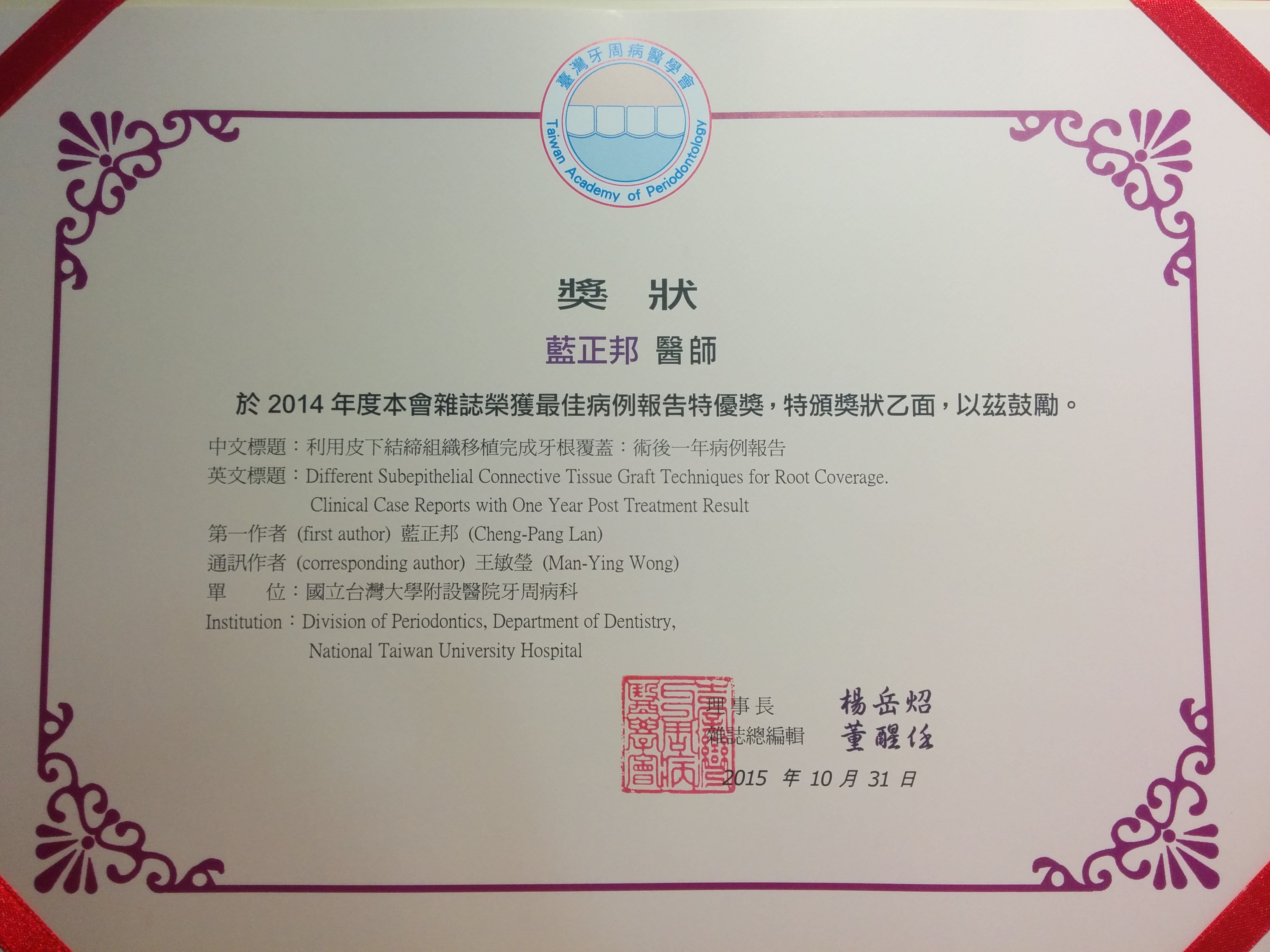 最後,還是告訴自己,正如所有年輕牙周人一樣的動機,考專科醫師的前提,要有一篇文章。此外,不過就是一位年輕醫師,在牙周病訓練時,為了解決病人問題,將過程記錄下來而已,那麼,就投出去吧。