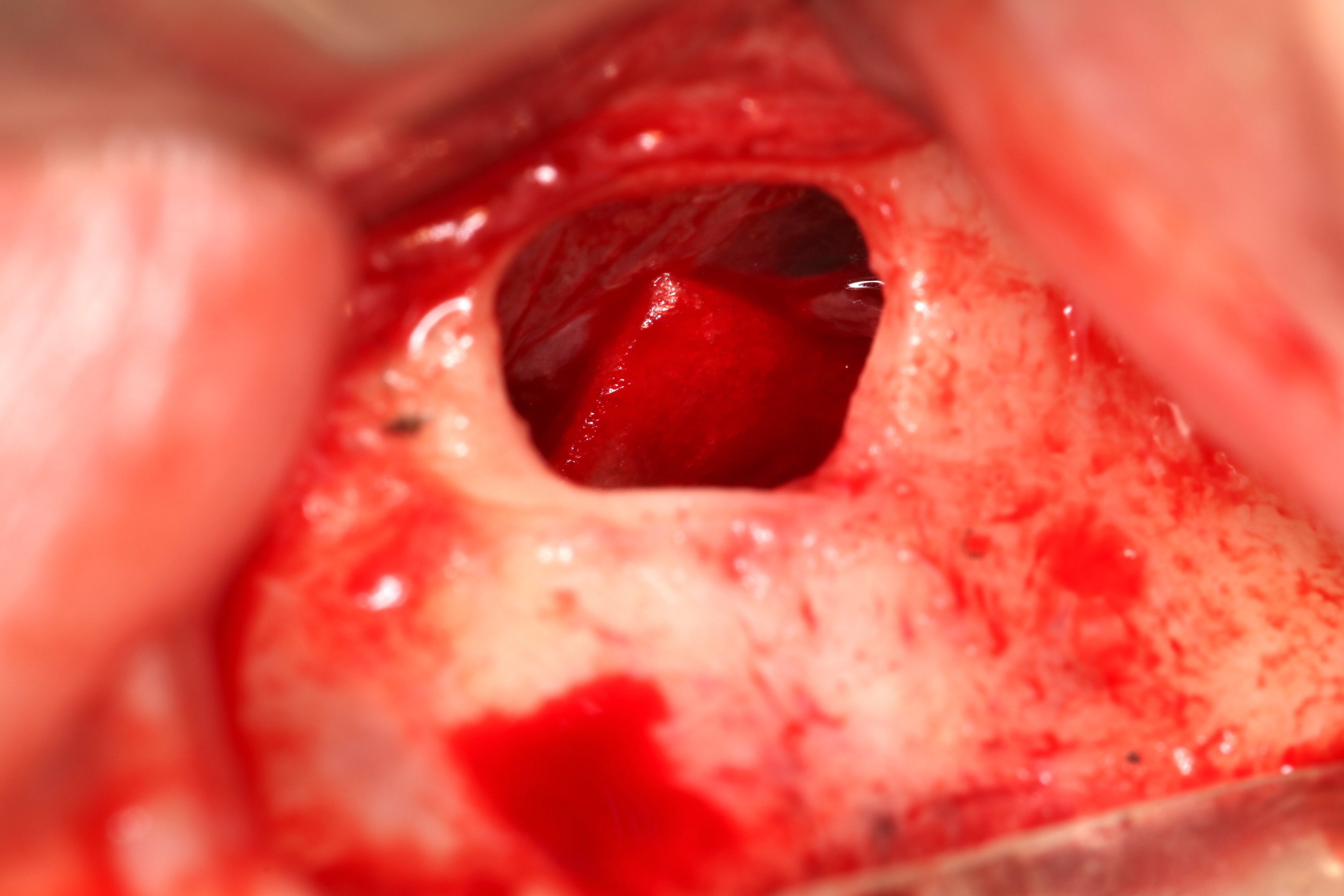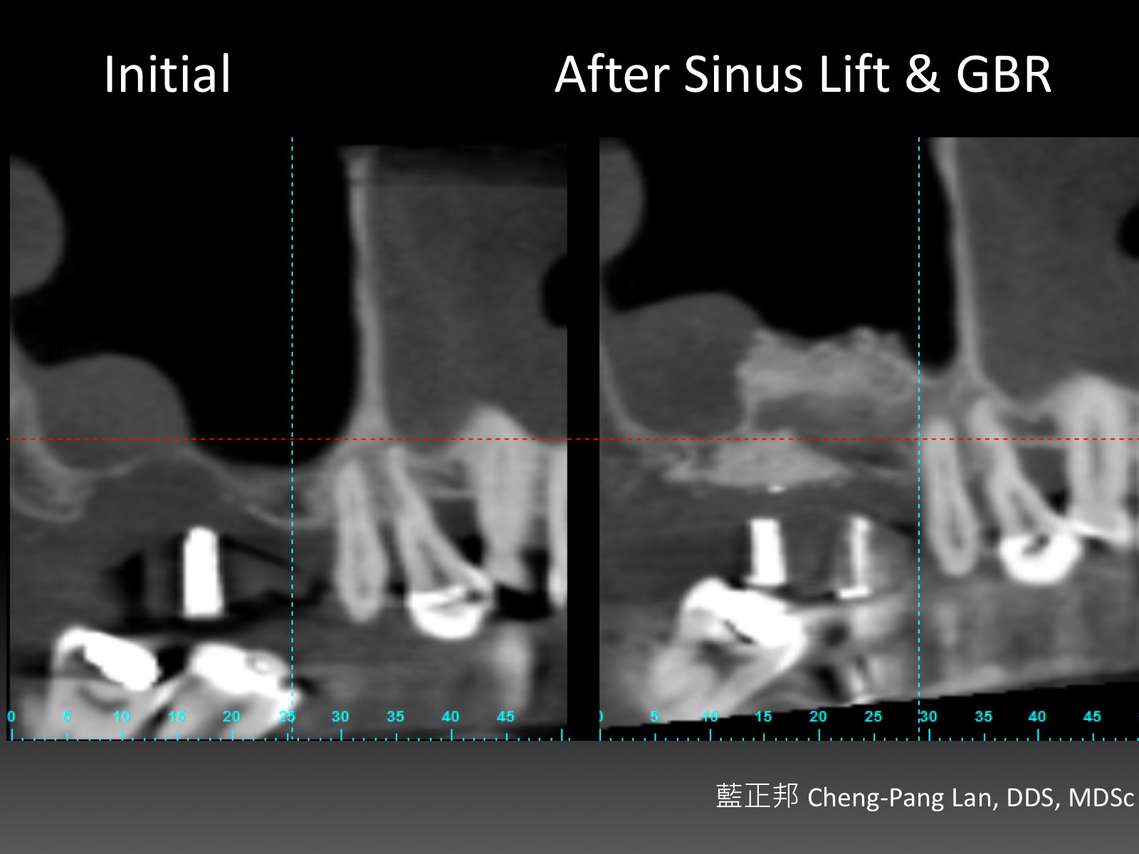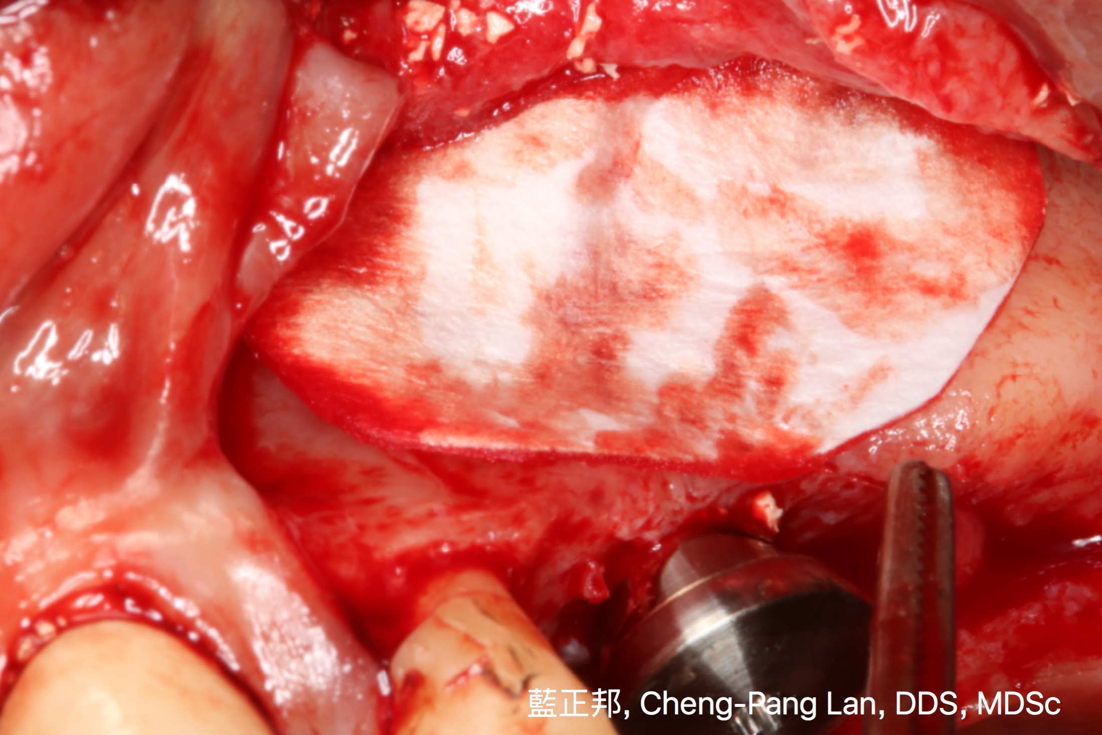 這也是我第一次嘗試在自然牙底下增高鼻竇,運氣不錯,自然牙底下的鼻竇質地平緩,只有顎側牙根稍有起伏,這也事先在3D模擬就知道,所以翻膜過程也不會感到驚訝與挫折。